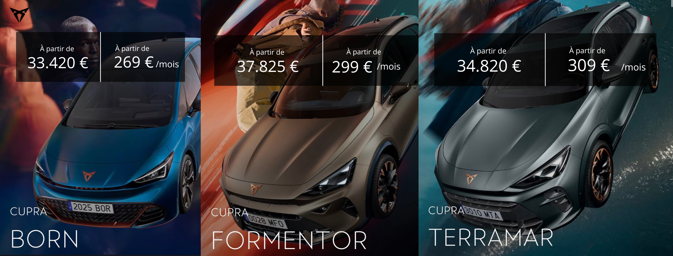 Vous pourrez également découvrir le Cupra Terramar, un SUV spacieux et élégant pensé pour allier confort, technologies de pointe et sensations de conduite. Il est proposé à partir de 34 820 € ou 309 € par mois.