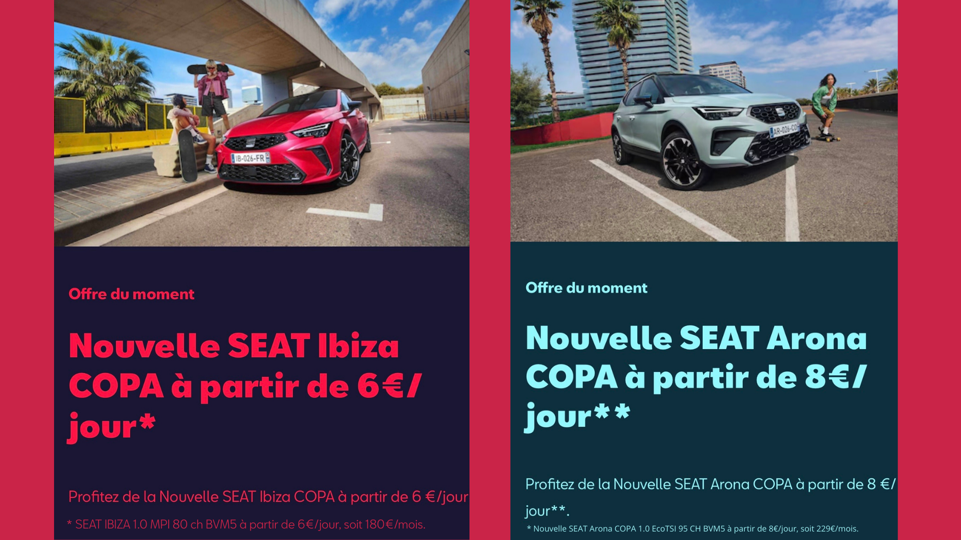 Le SEAT Arona, SUV compact polyvalent, offre davantage d’espace et de confort pour les trajets quotidiens comme pour les week-ends. Il est disponible à partir de 8 € par jour.