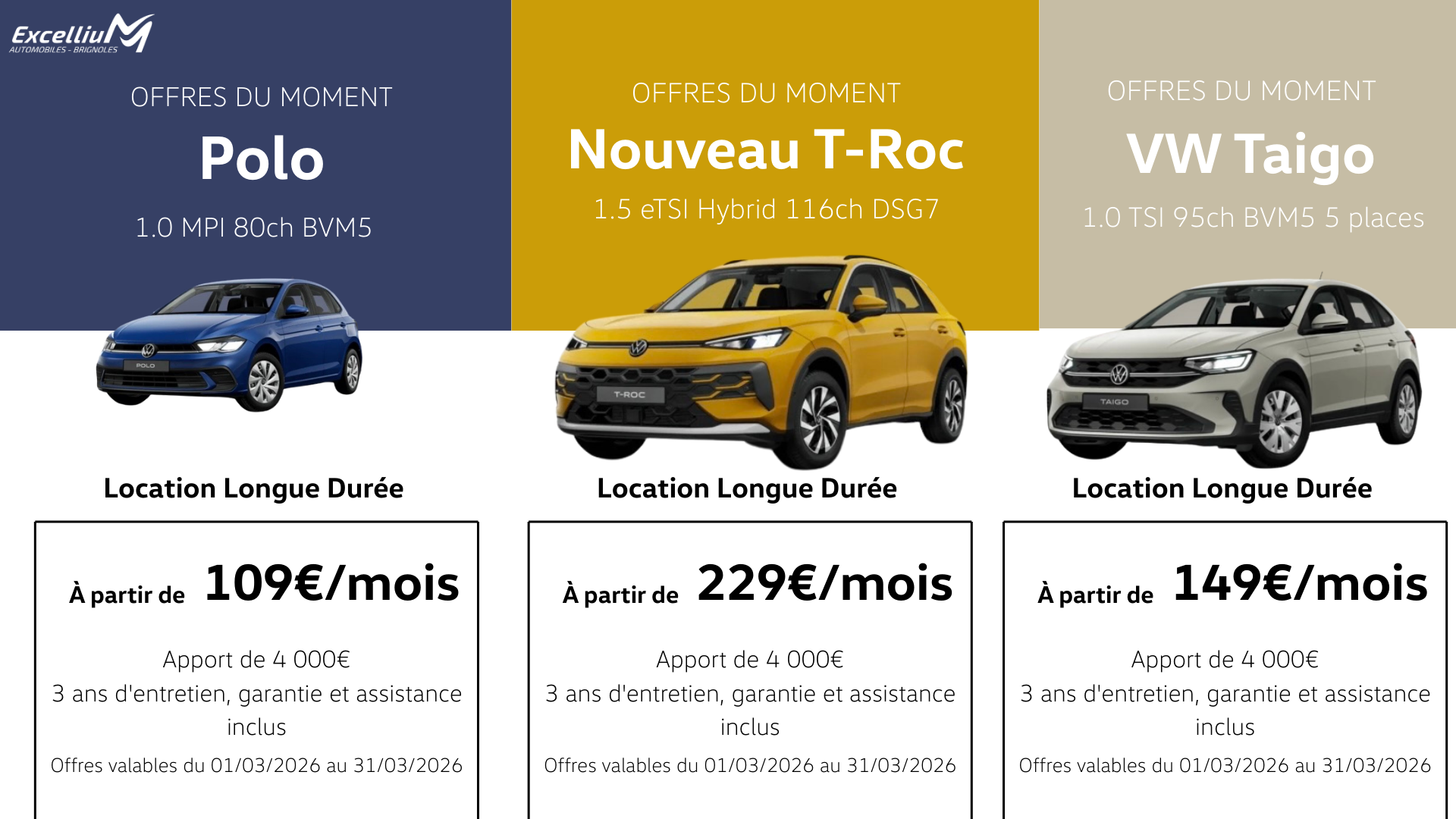 Enfin, venez découvrir le Volkswagen T-Roc, un SUV polyvalent et dynamique qui séduit par son confort et ses équipements. Il est proposé à partir de 229 € par mois.